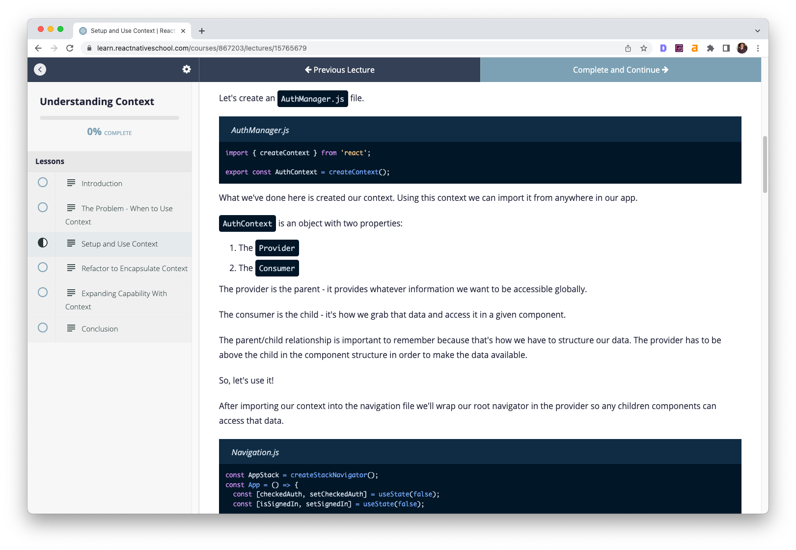 This course is awesome for anyone who needs to get started developing mobile application in React Native. I took the course and I learned some of the best practices required when using React Native. I particularly liked the directory structure and the use of the Context API to manage global state. I would recommend anyone to take the course.